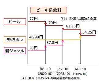 - 2020年10月:第1段階の酒税改正。ビール値下げ、新ジャンル値上げ
